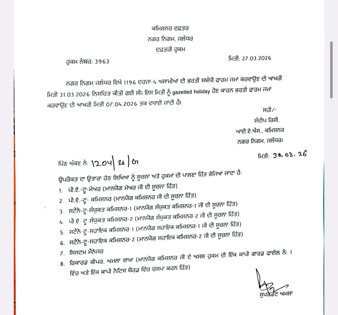 ਨਗਰ ਨਿਗਮ ਜਲੰਧਰ ਵਿਖੇ 1196 ਦਰਜਾ-4 ਅਸਾਮੀਆਂ ਦੀ ਭਰਤੀ ਸਬੰਧੀ ਫਾਰਮ ਜਮਾਂ ਕਰਵਾਉਣ ਦੀ ਆਖਰੀ ਮਿਤੀ 31.03.2026 ਨਿਸ਼ਚਿਤ ਕੀਤੀ ਗਈ ਸੀ। ਇਸ ਮਿਤੀ ਨੂੰ gazetted holiday ਹੋਣ ਕਾਰਨ ਭਰਤੀ ਫਾਰਮ ਜਮਾਂ ਕਰਵਾਉਣ ਦੀ ਆਖਰੀ ਮਿਤੀ 07.04.2026 ਤਕ ਵਧਾਈ ਜਾਂਦੀ ਹੈ।