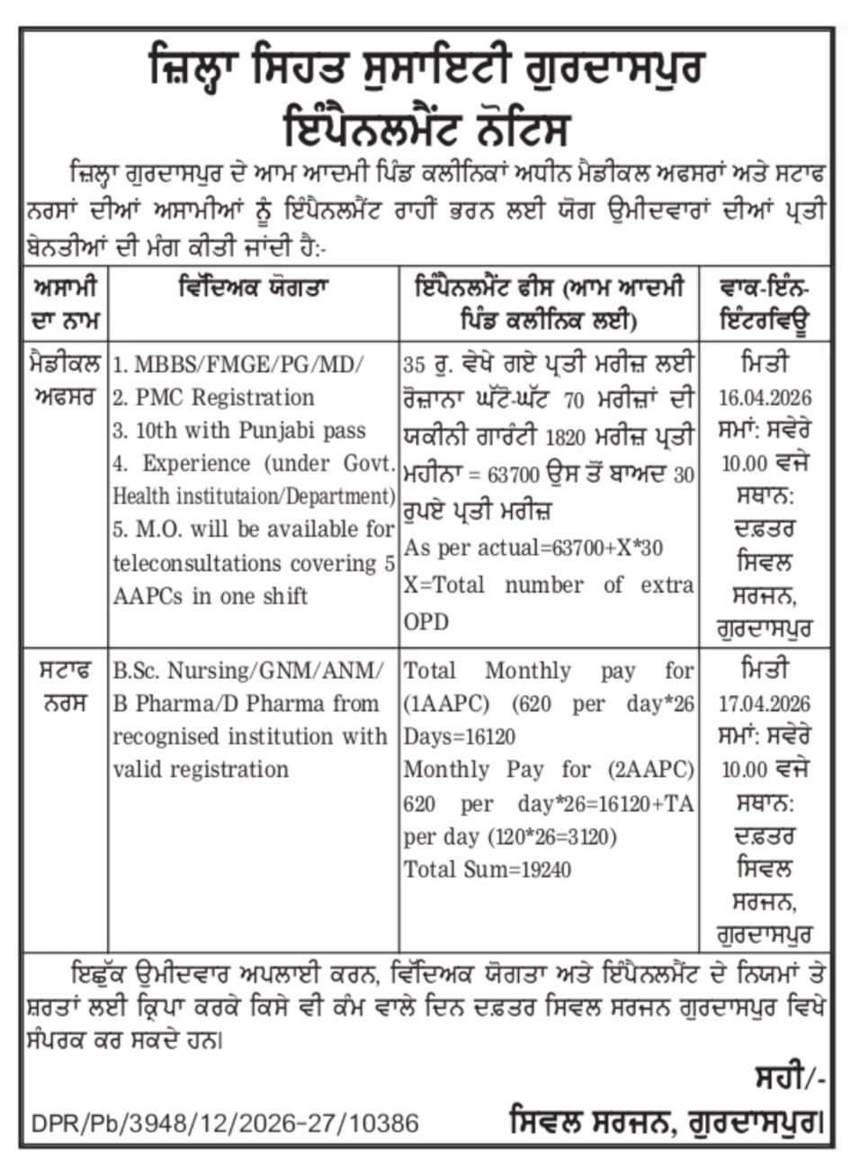 1. MBBS/FMGE/PG/MD/2. PMC Registration 3. 10th with Punjabi pass 4. Experience (under Govt. Health institutaion/Department) 5. M.O. will be available for teleconsultations covering 5 AAPCs in one shift | ਮਿਤੀ 16.04.2026 ਸਮਾਂ: ਸਵੇਰੇ 10.00 ਵੱਜੇ ਸਥਾਨ: ਦਫ਼ਤਰ ਸਿਵਲ ਸਰਜਨ, ਗੁਰਦਾਸਪੁਰ |